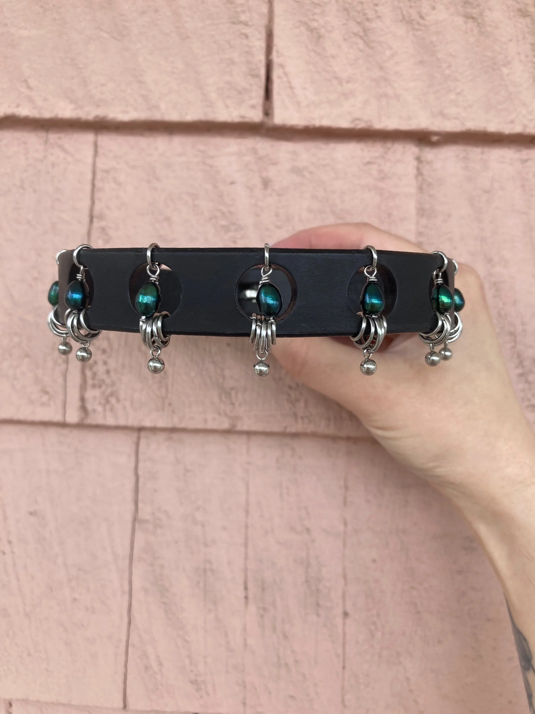 3/4’’ choker made with scrap leather, old stock, and recycled pearls. Stainless steel and nickel plated hardware. Fits a 12-15” neck (please email or leave a comment in the notes if you’d like to adjust the sizing :)) Made to order in 7 drop style. Select color option.
