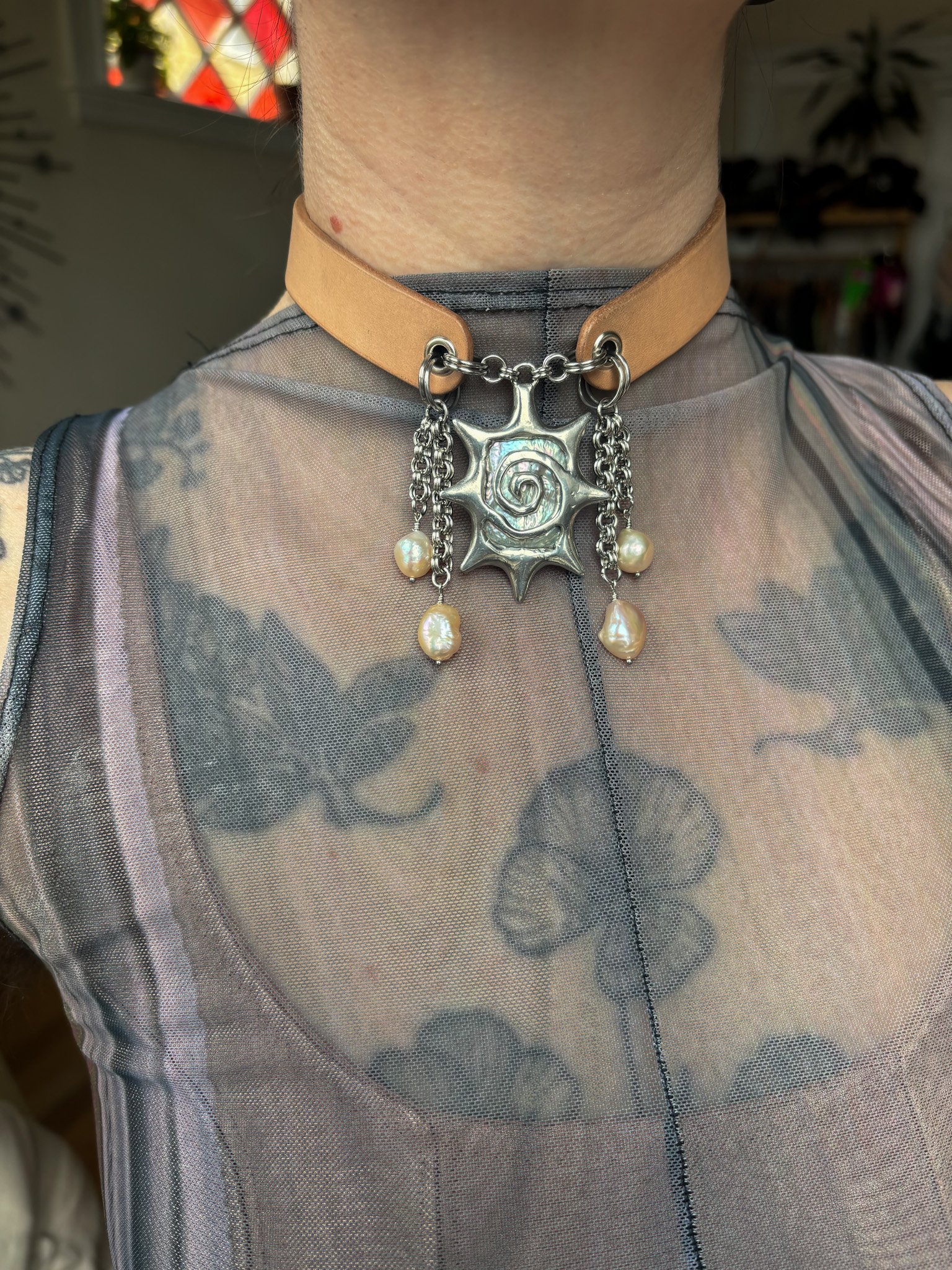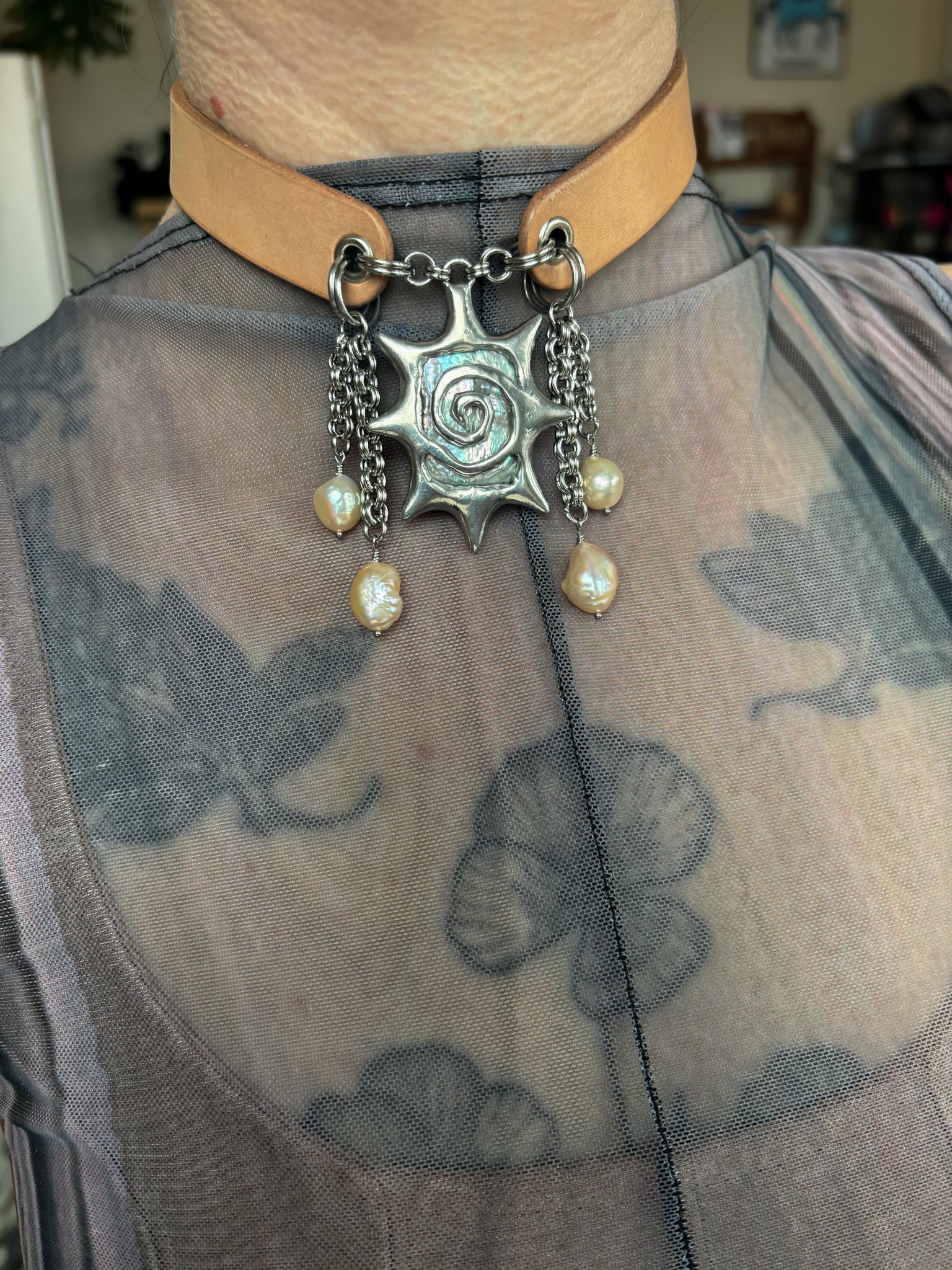Choker made with scrap leather and recycled freshwater pearls. Soft soldered baroque pearl pedant (silver, tin, copper alloy). Stainless steel jump rings and beads. Nickel plated buckle and choker hardware. Fits 12-14” neck seen here on 12.25” neck.