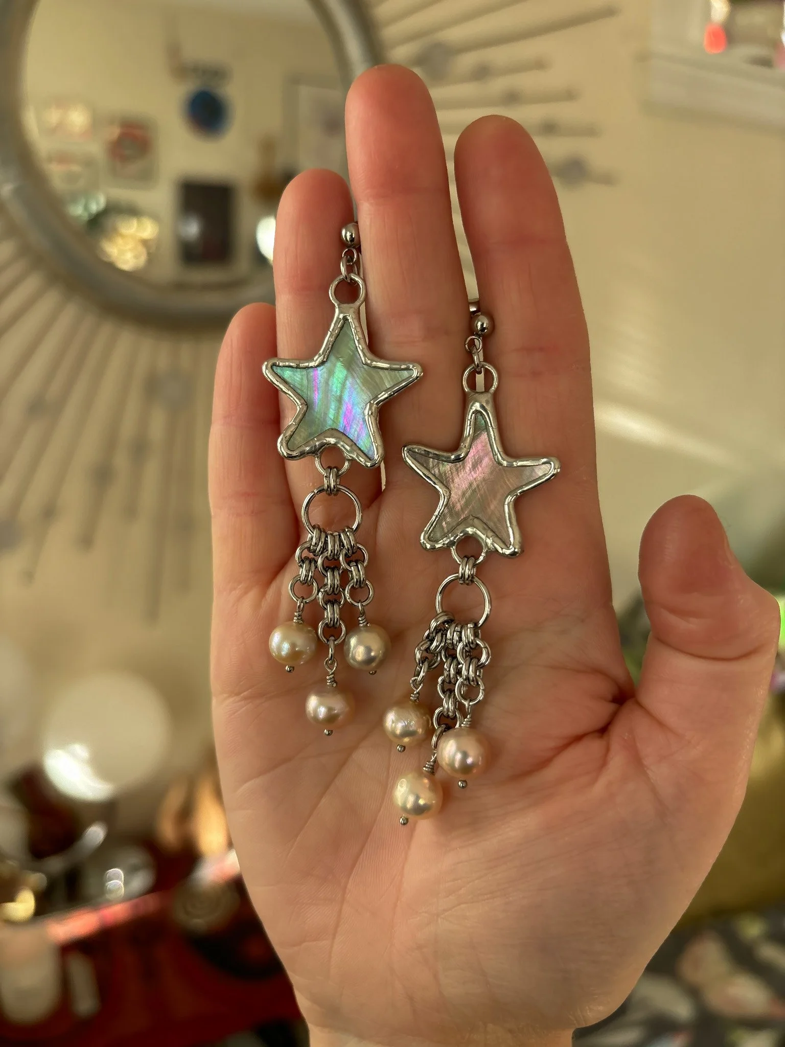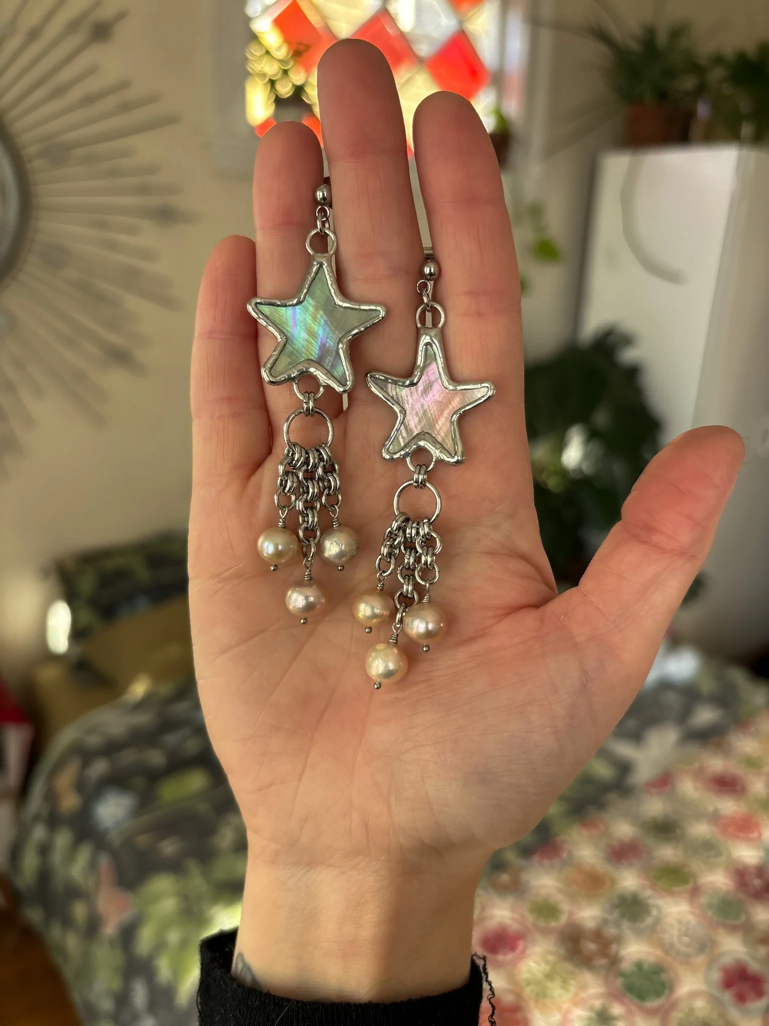 Hand cut mother of pearl earrings made with vintage shells. Soft soldered pendants (silver, tin, copper alloy). Old stock freshwater pearls. Stainless steel findings.