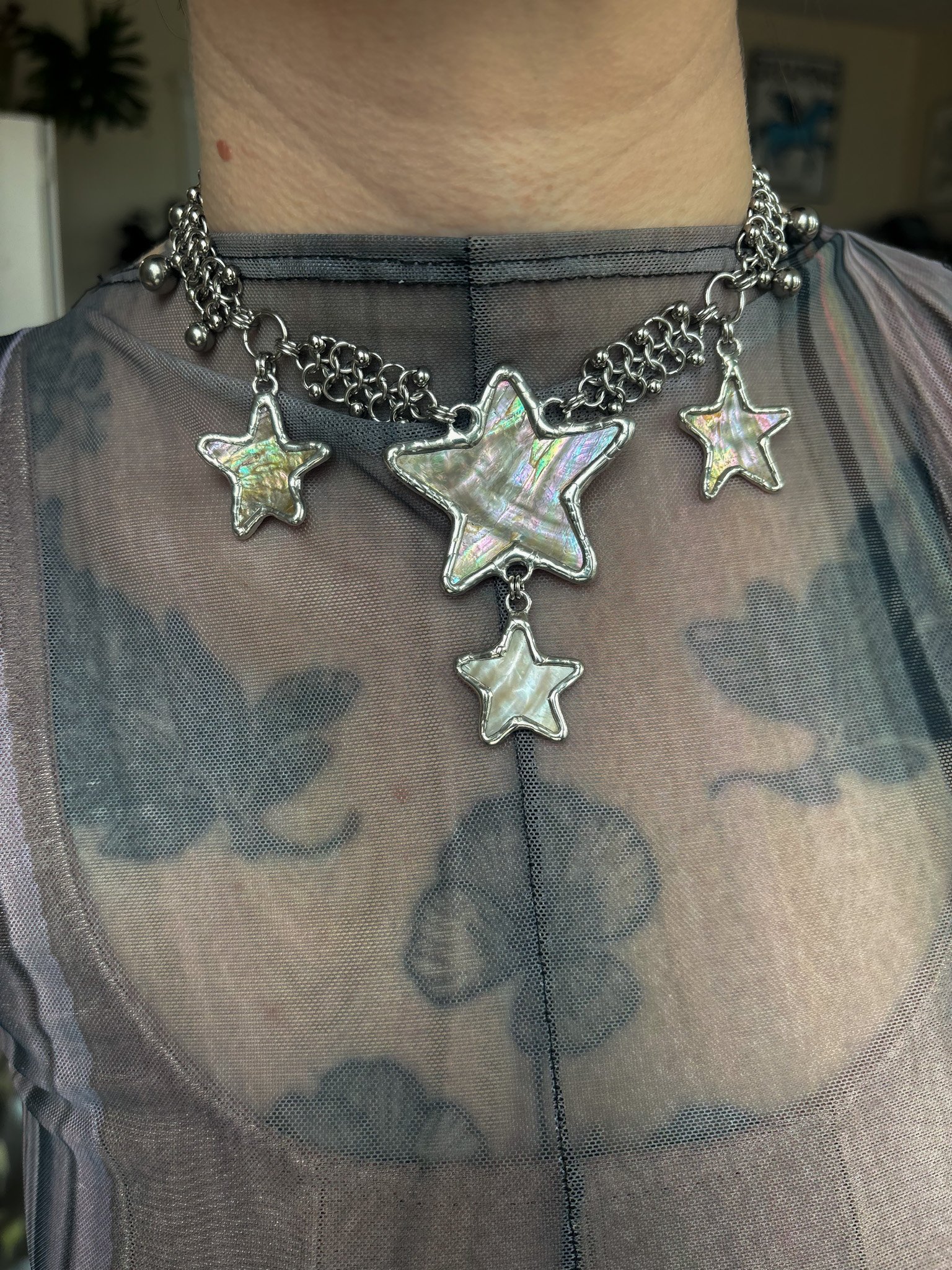 Necklace made with hand cut vintage shells. Soft soldered pendants (silver, tin, copper alloy). Stainless steel body and findings. Size 12-14” shown on 12.25” neck. Adjust size in notes at checkout!