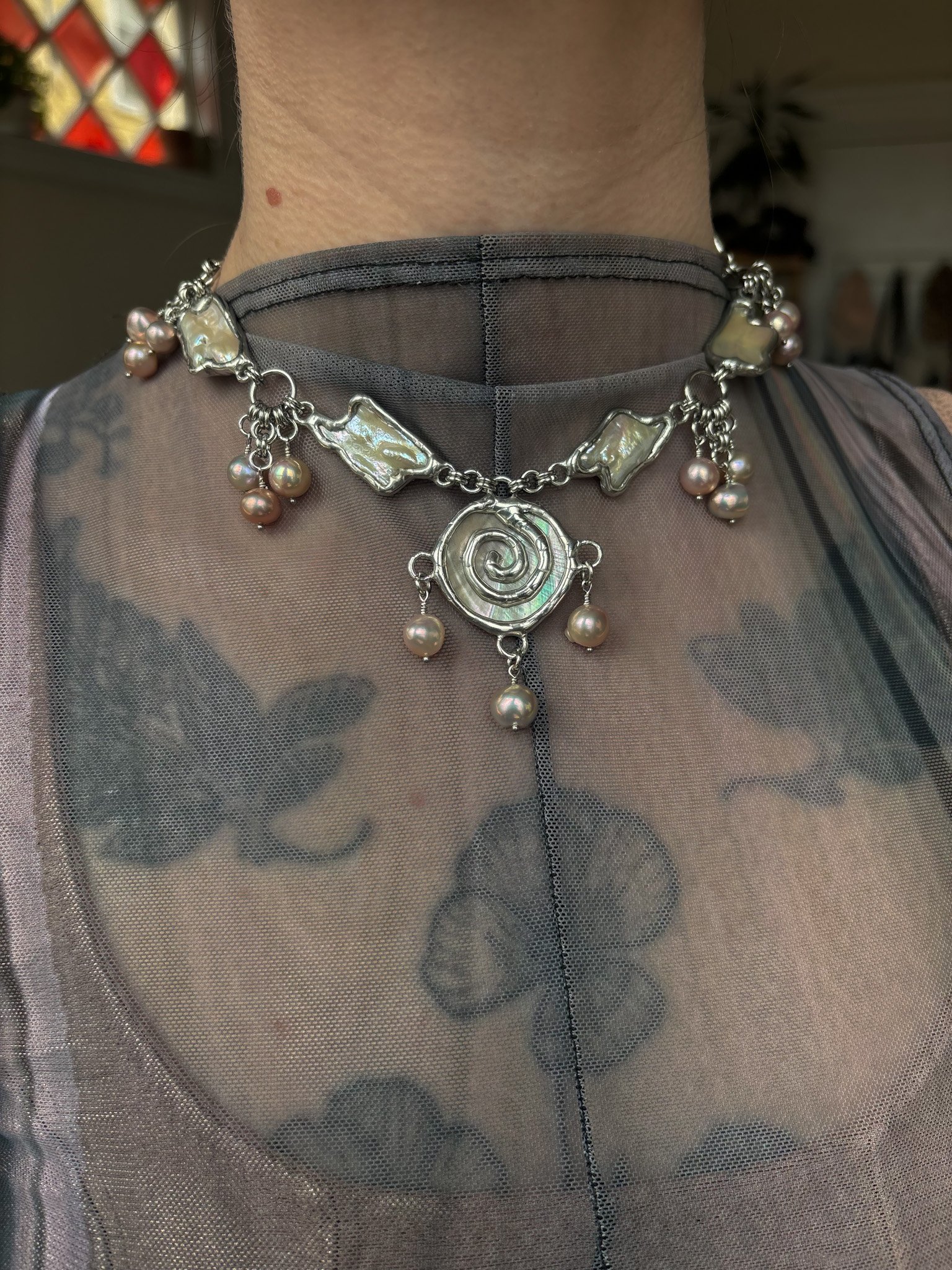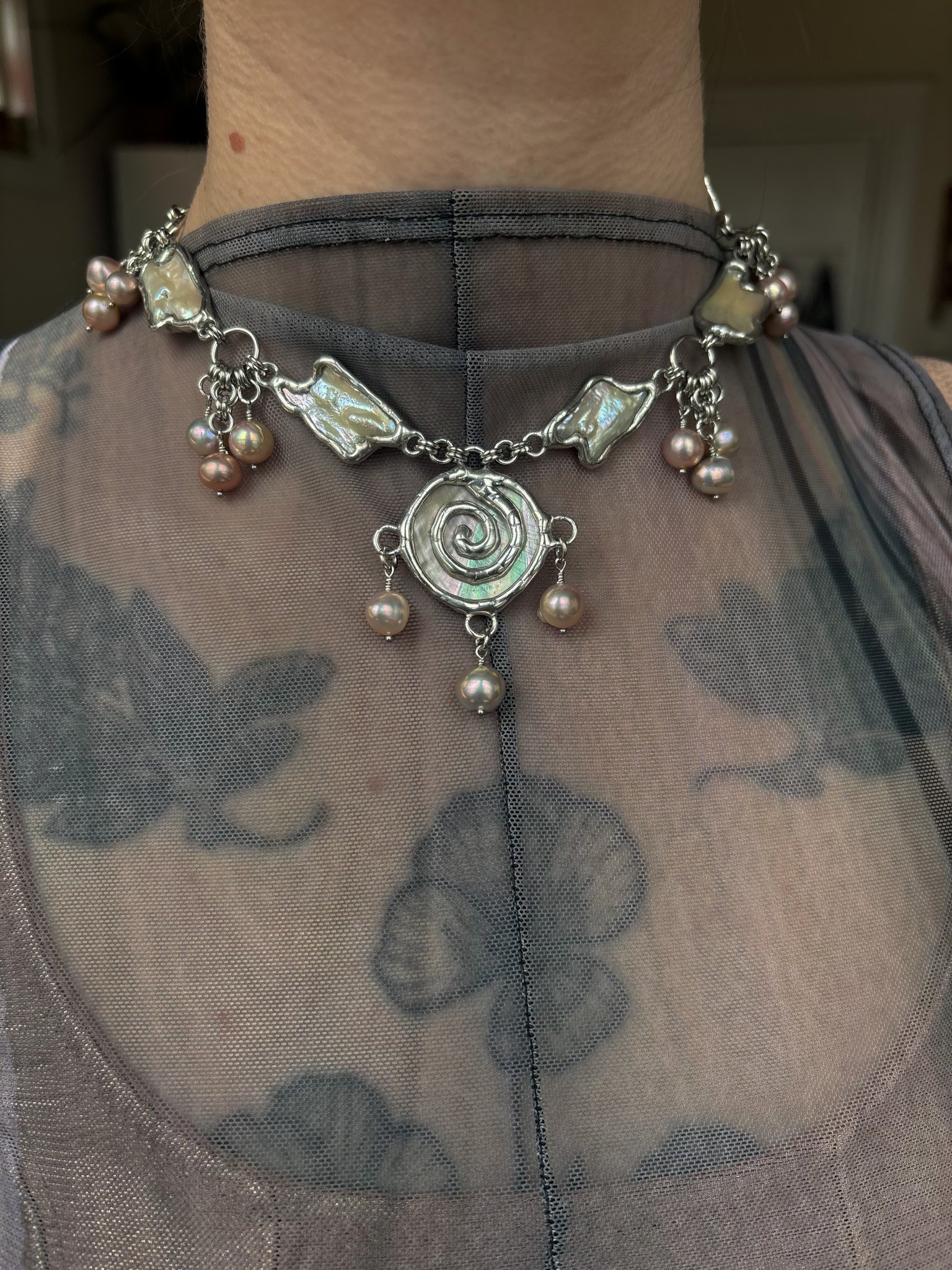 Necklace made with old stock mother of pearl and old stock freshwater pearls. Soft soldered pendants (silver, tin, copper alloy). Stainless steel body and findings. Size 12-14” shown on 12.25” neck. Adjust size in notes at checkout!