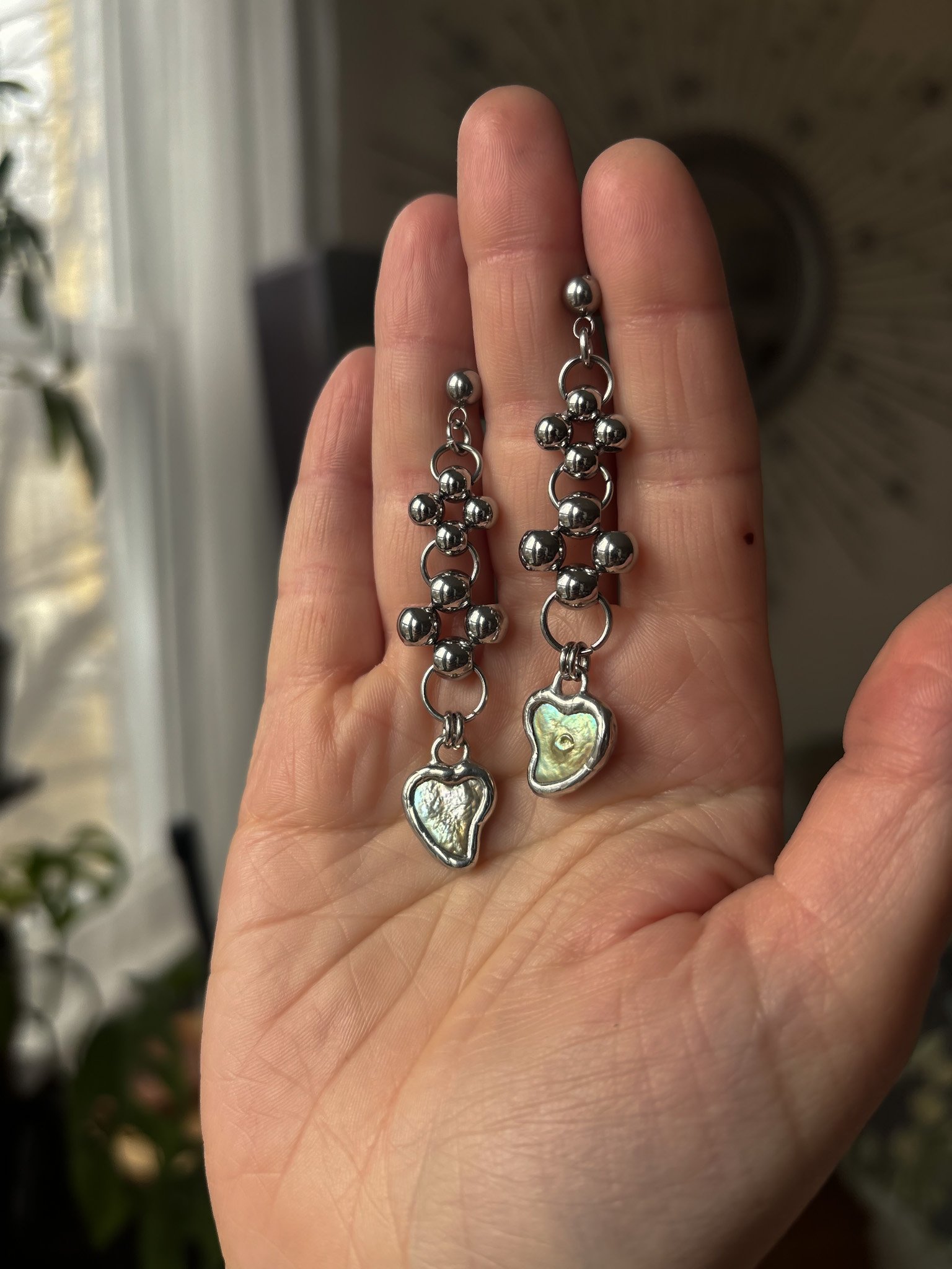 Shop › Heart Earrings Image 1 of 1 Heart Earrings $65.00 Earrings made with old stock pearls. Soft soldered pendants (silver, tin, copper alloy). Stainless steel findings. Add To Cart Added! Earrings made with old stock pearls. Soft soldered pendants (silver, tin, copper alloy). Stainless steel findings.