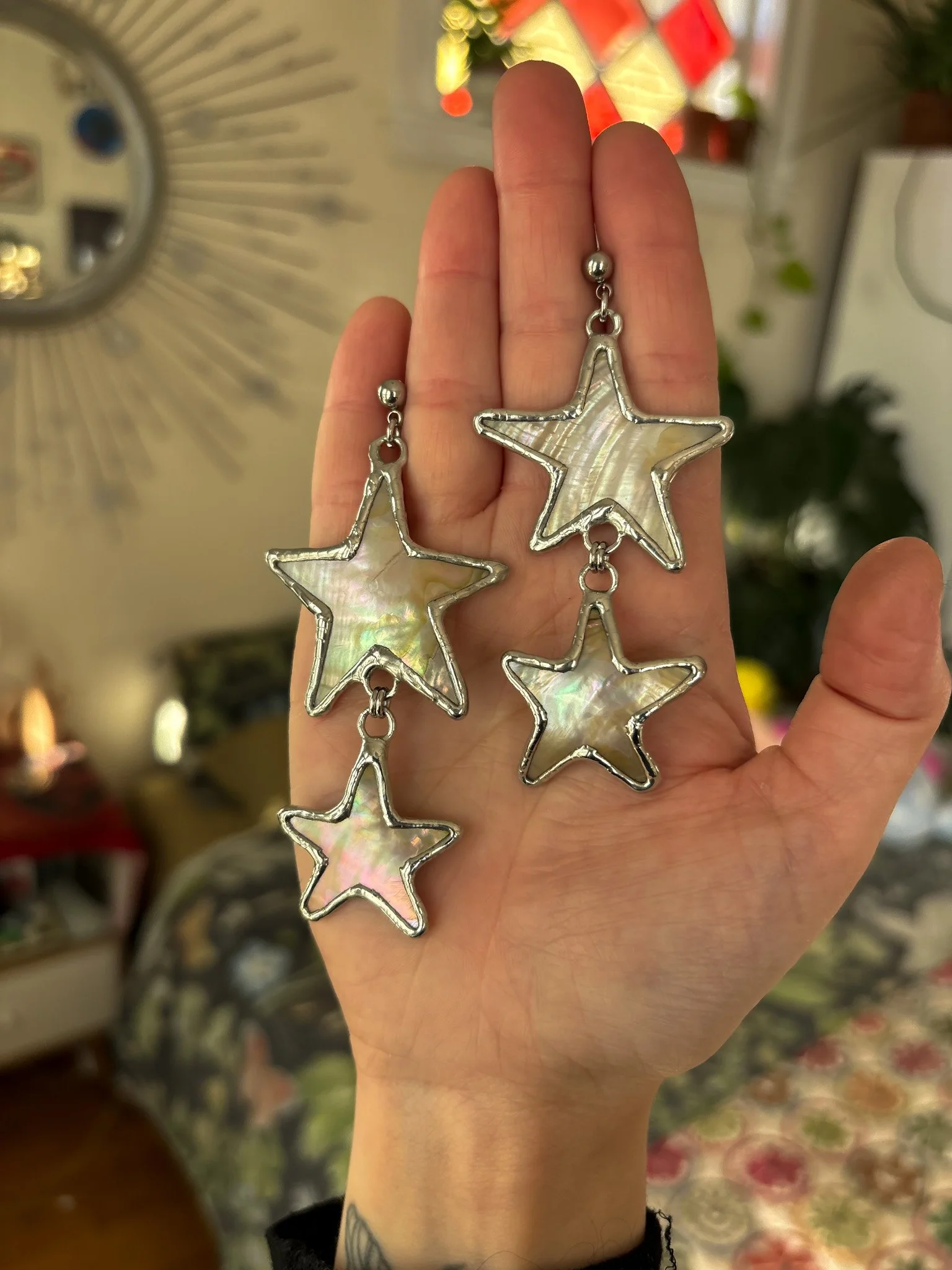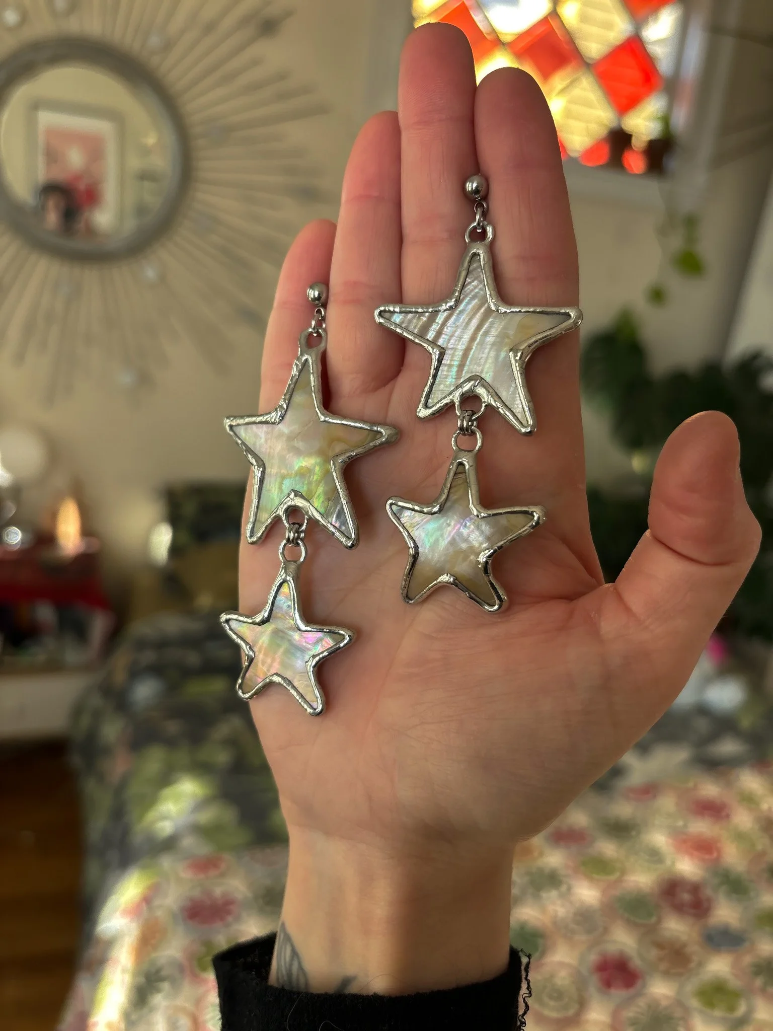 Hand cut mother of pearl earrings made with vintage shells. Soft soldered pendants (silver, tin, copper alloy). Stainless steel findings.