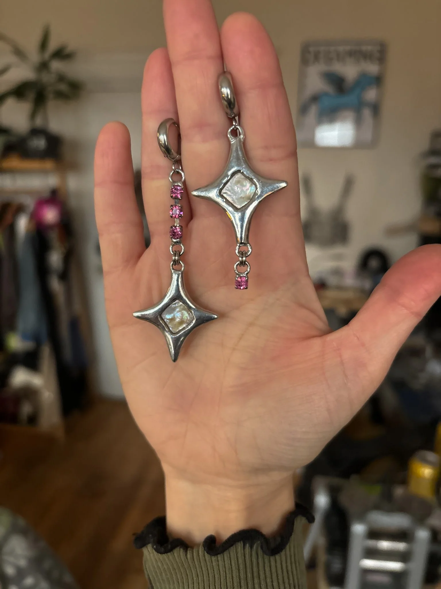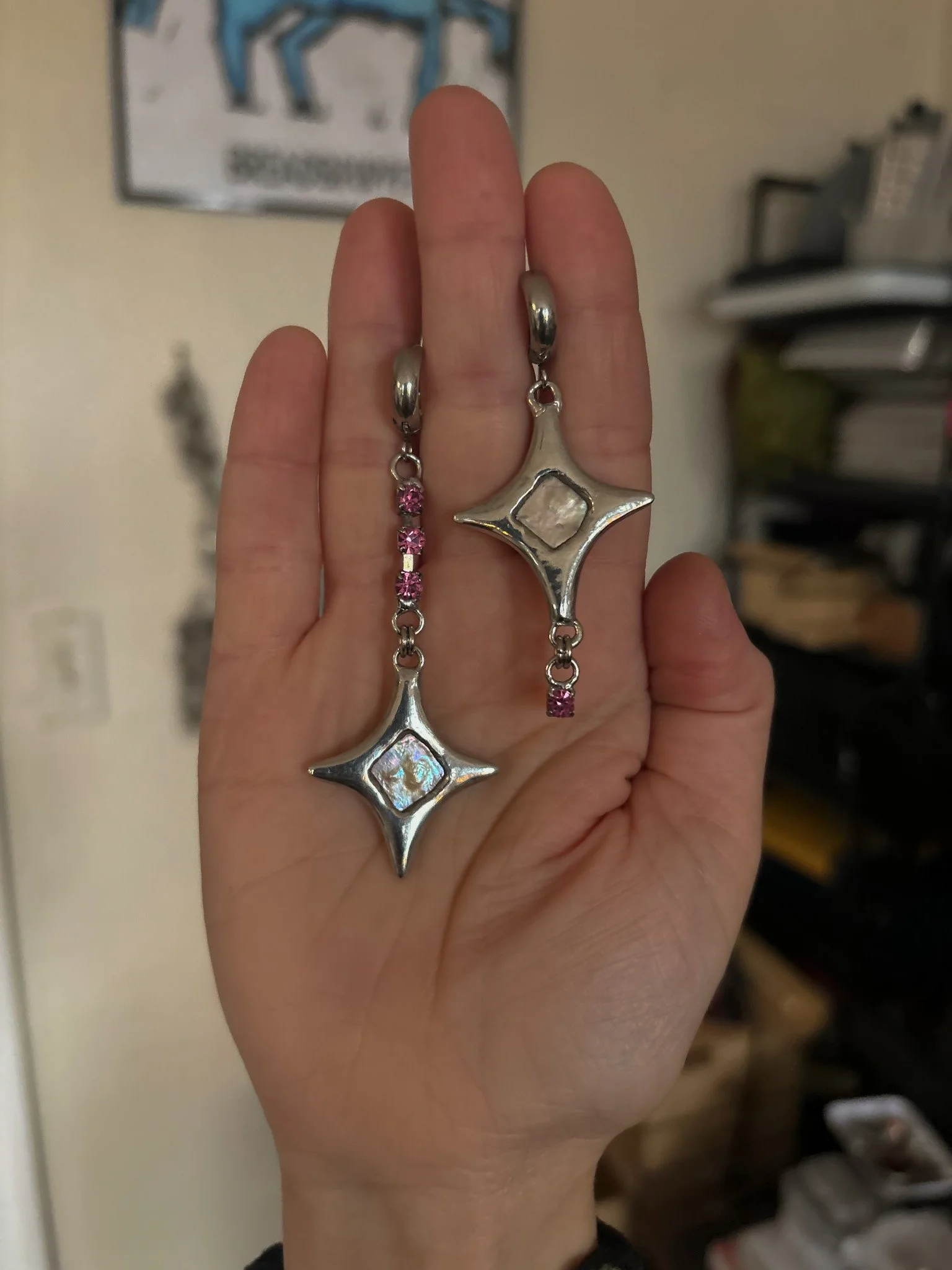 Earrings made with recycled freshwater pearls and vintage rhinestones. Soft soldered pendants (silver, tin, copper alloy). Stainless steel findings.