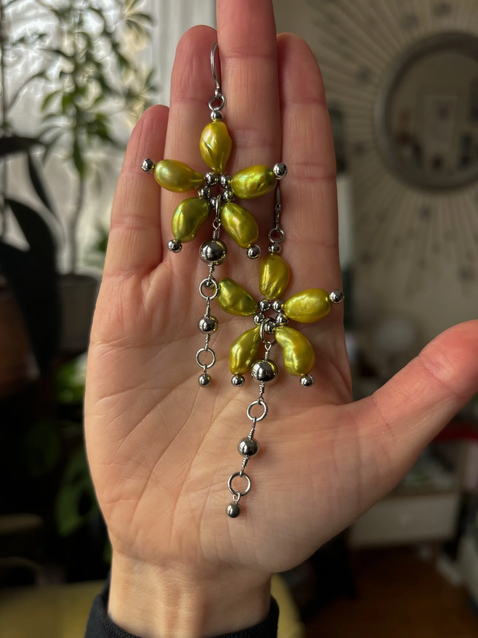 Made with old stock freshwater pearls and stainless steel. Made to order.