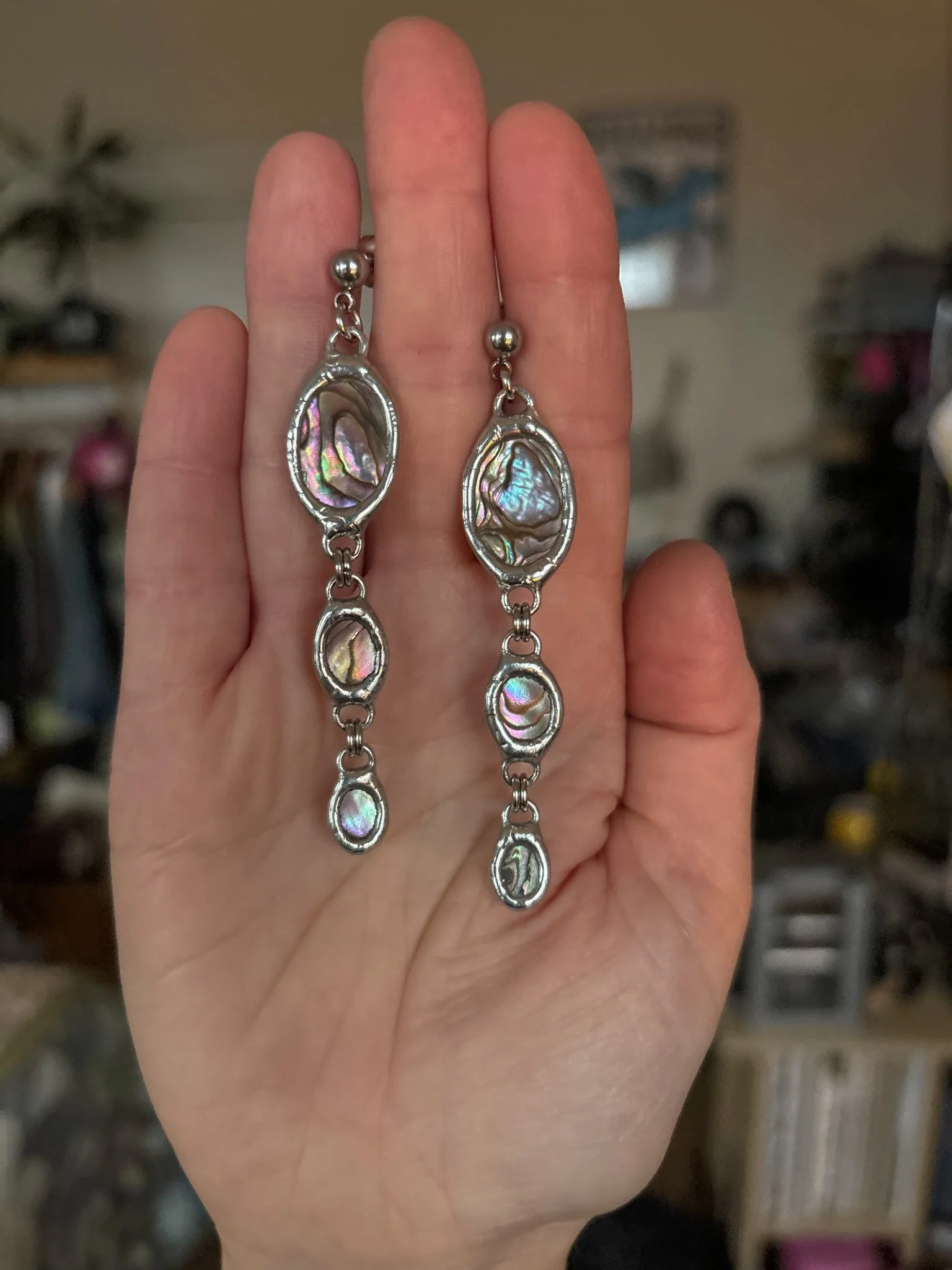 Earrings made with old stock abalone cabochons. Soft soldered pendants (silver, tin, copper alloy). Stainless steel findings.
