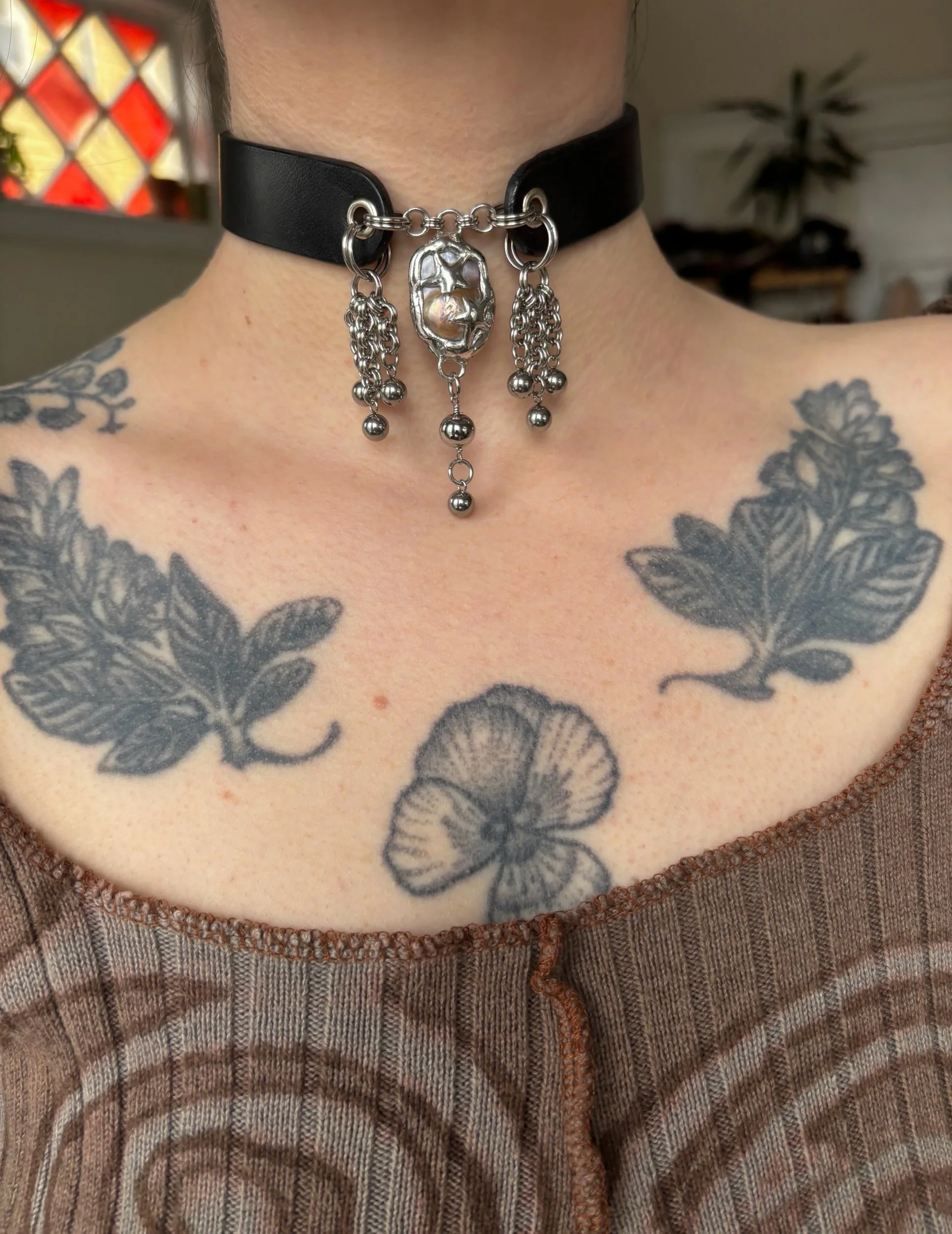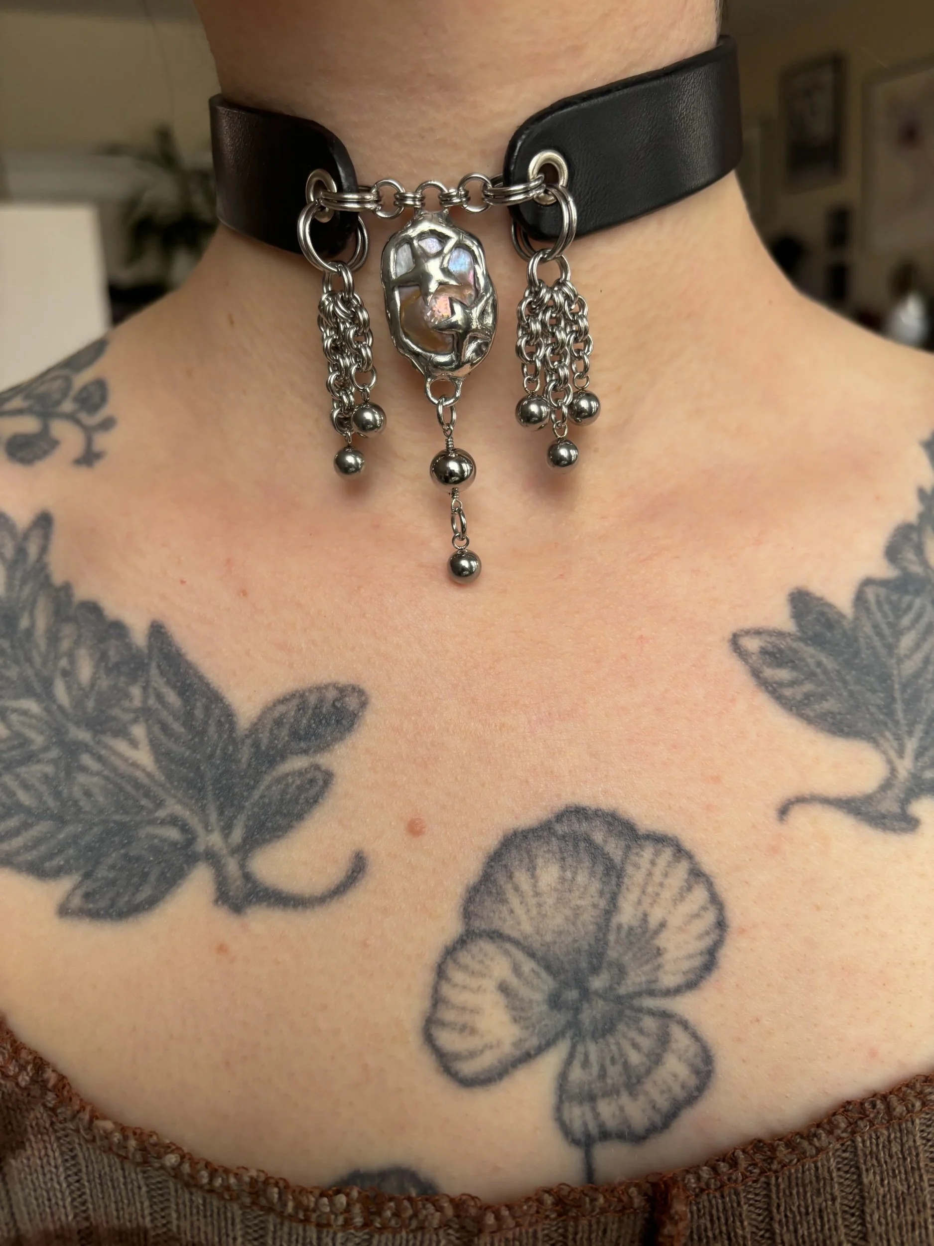Choker made with scrap leather and a recycled freshwater pearl. Soft soldered pedant (silver, tin, copper alloy). Stainless steel jump rings and beads. Nickel plated buckle and choker hardware. Fits 11.5-14” neck seen here on 12.25” neck.