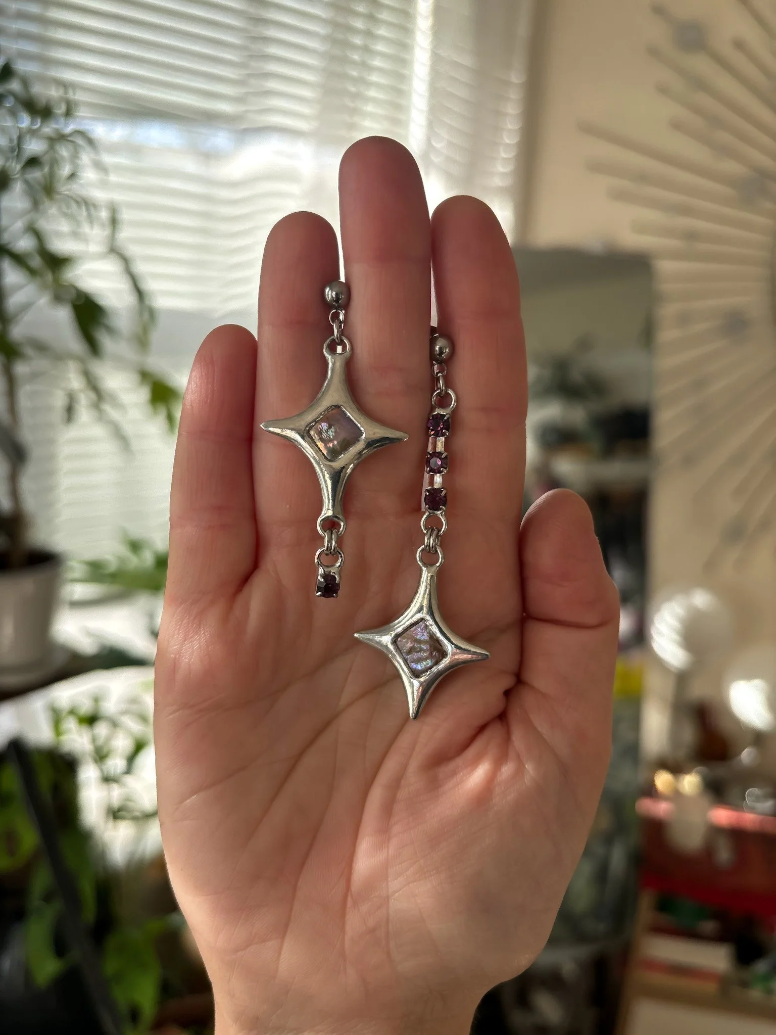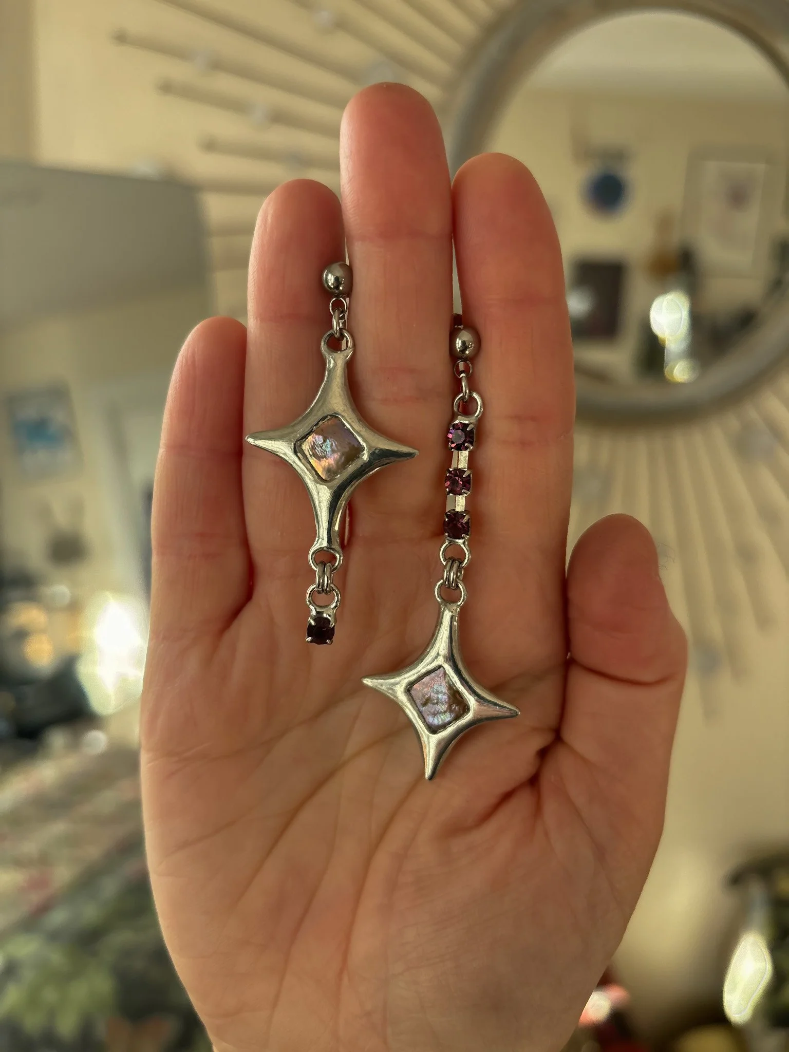 Earrings made with recycled freshwater pearls and vintage rhinestones. Soft soldered pendants (silver, tin, copper alloy). Stainless steel findings.