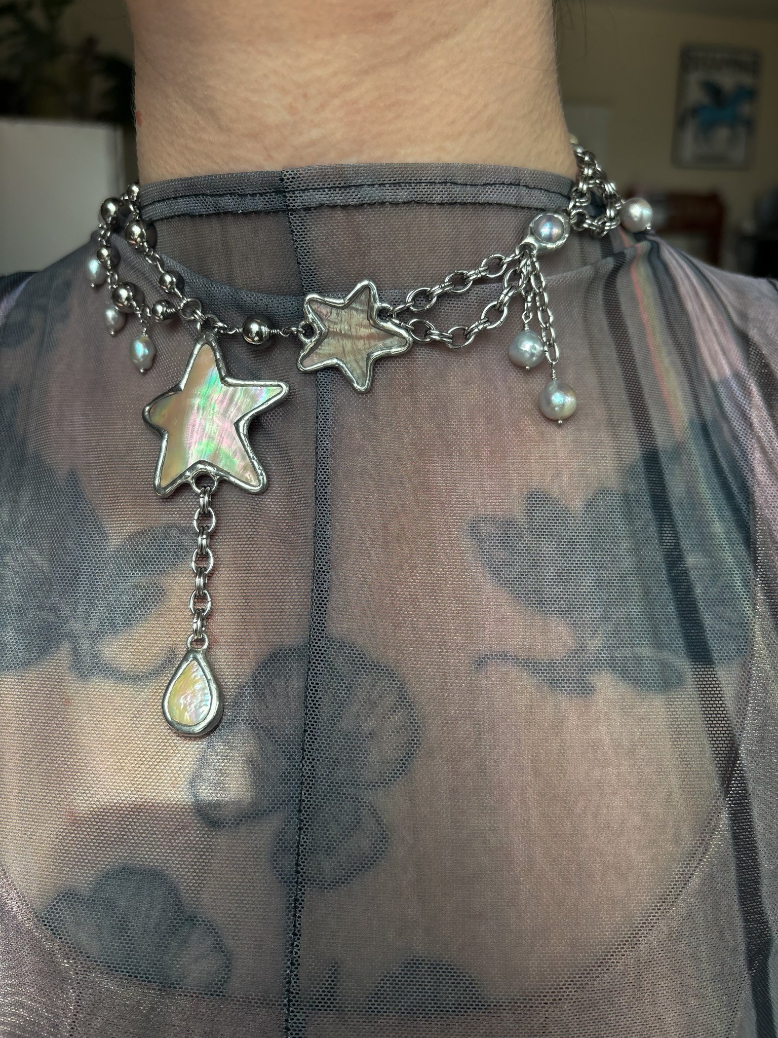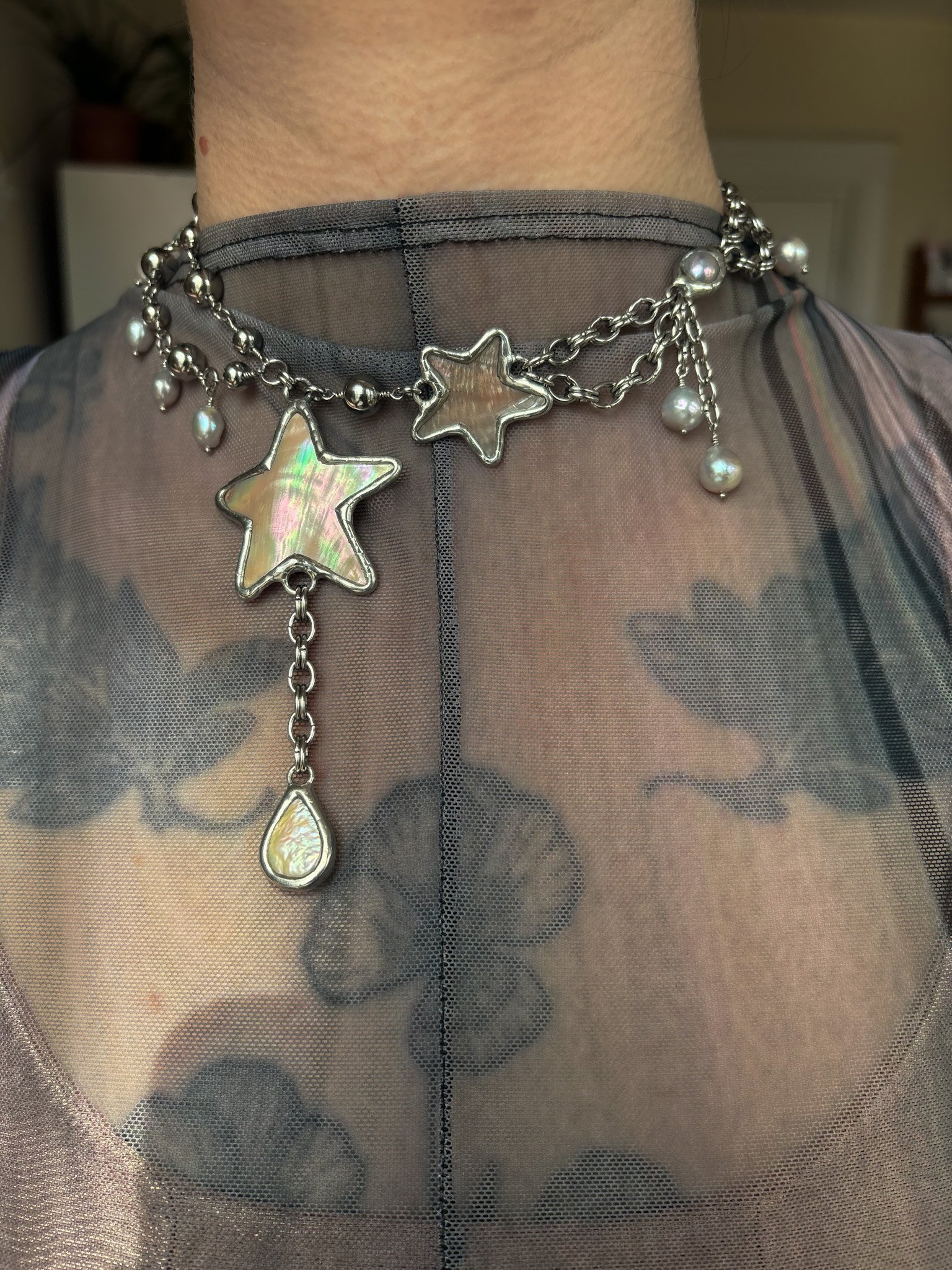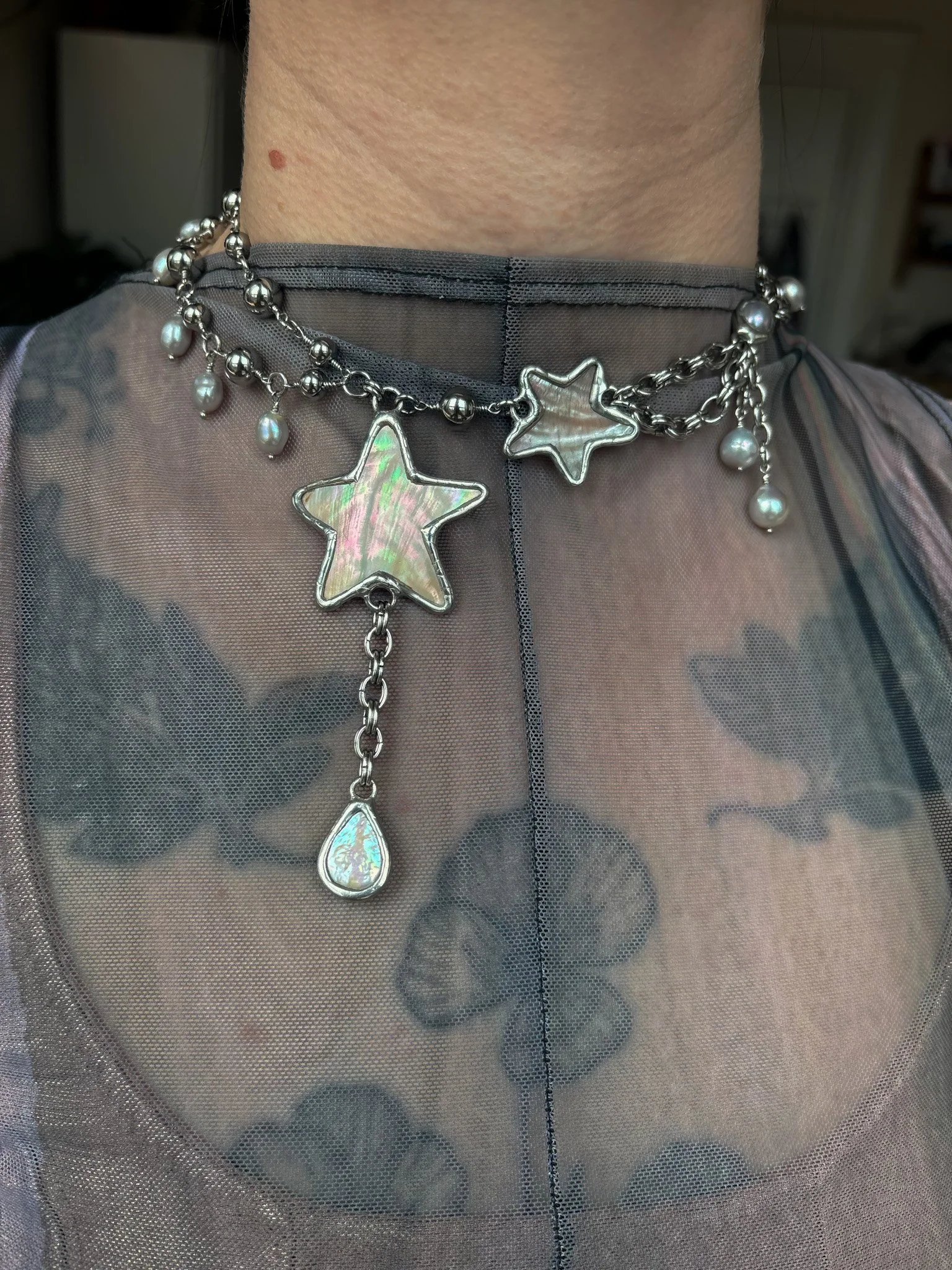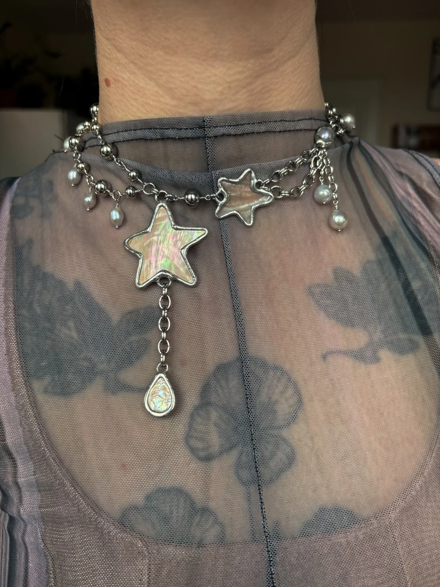 Necklace made with hand cut vintage shells and recycled freshwater pearls. Soft soldered pendants (silver, tin, copper alloy). Stainless steel body and findings. Size 12-14” shown on 12.25” neck. Adjust size in notes at checkout!