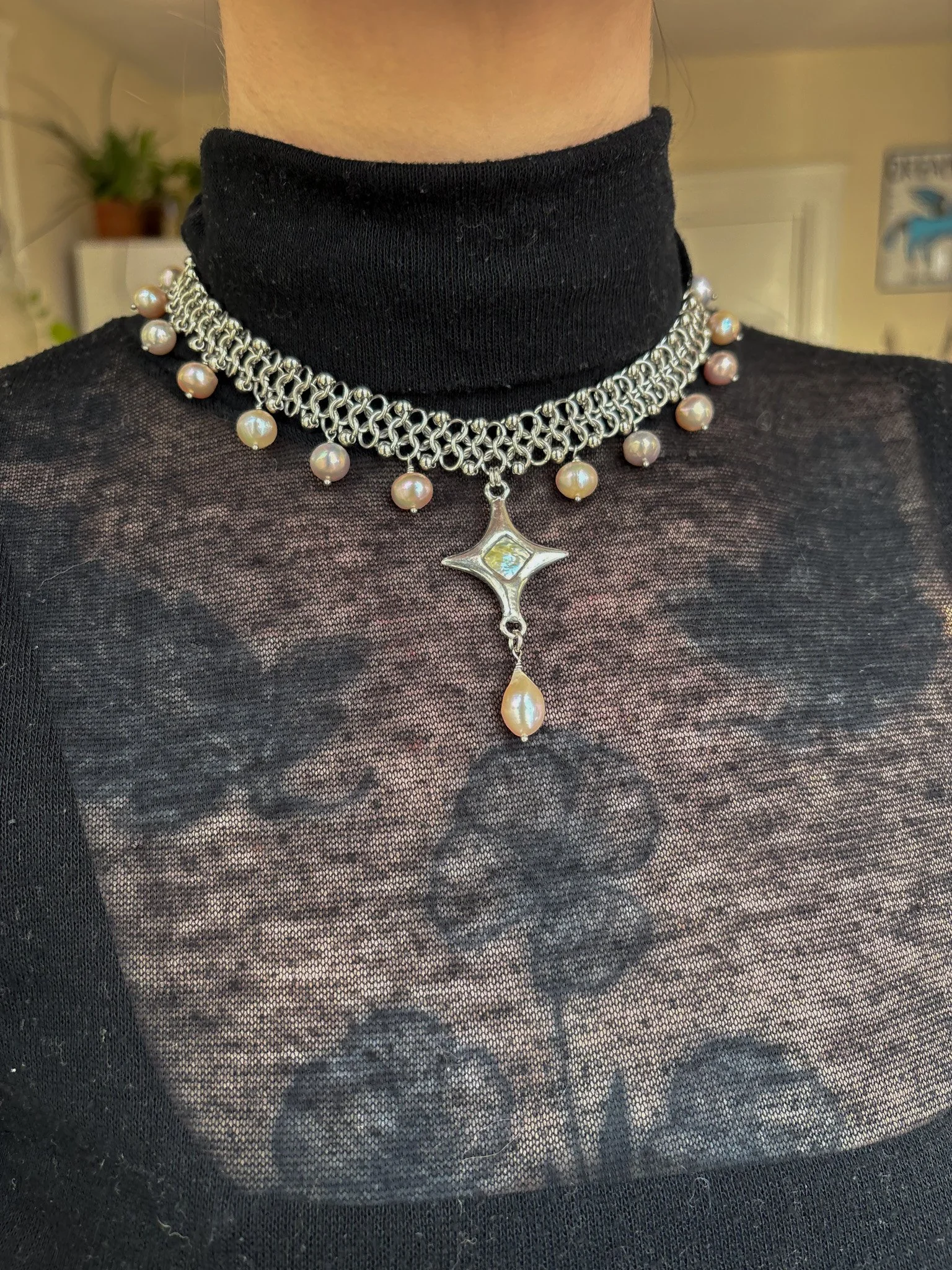 Necklace made with old stock freshwater pearls. Soft soldered recycled pearl pendant (silver, tin, copper alloy). Stainless steel body and findings. Size 12-14” shown on 12.25” neck. Adjust size in notes at checkout!