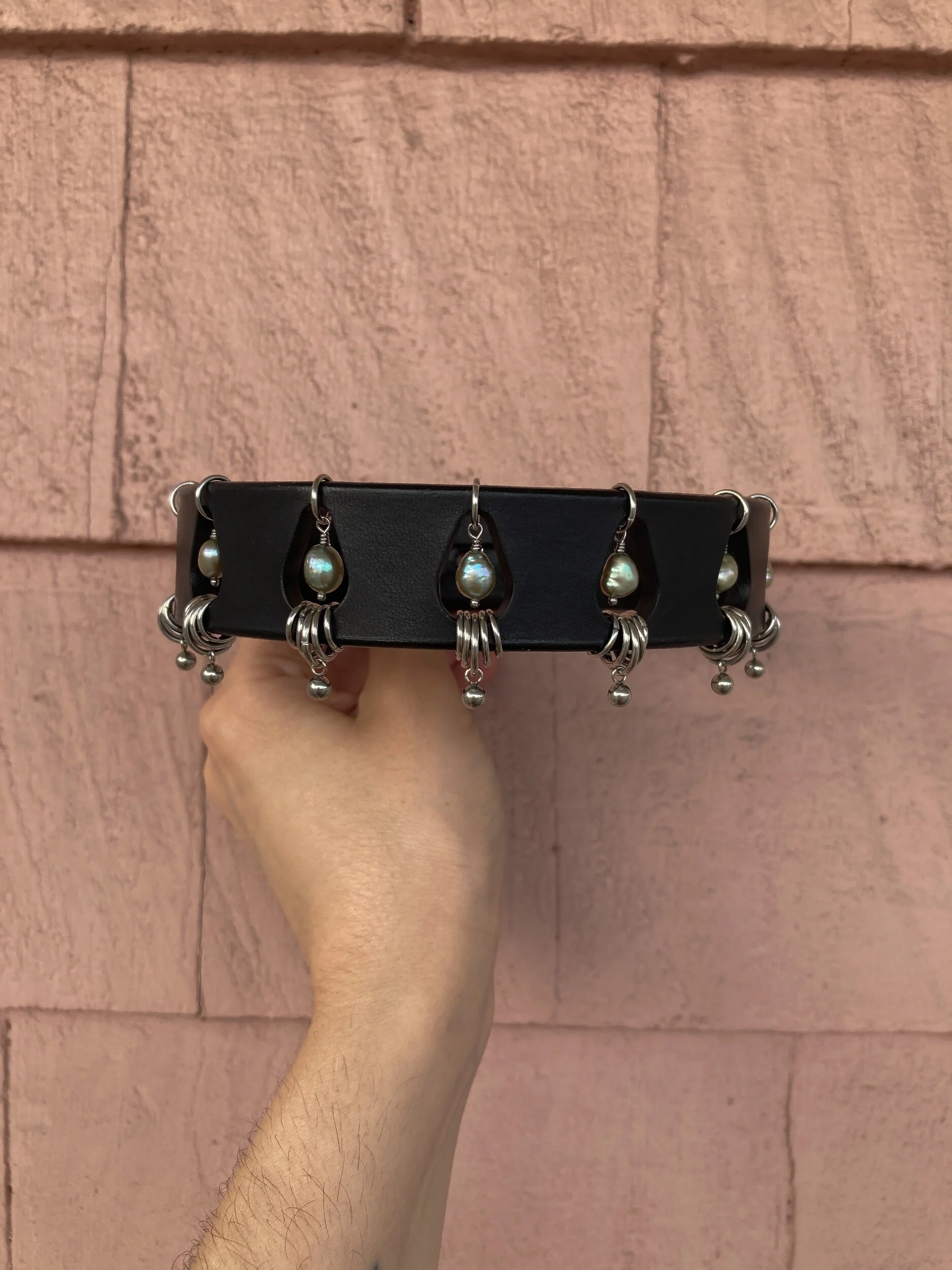 1’’ choker made with scrap leather, old stock, vintage and/or recycled pearls. Stainless steel and nickel plated hardware. Fits a 12-15” neck. Please leave a comment in the notes at checkout if you’d like to adjust the sizing :)