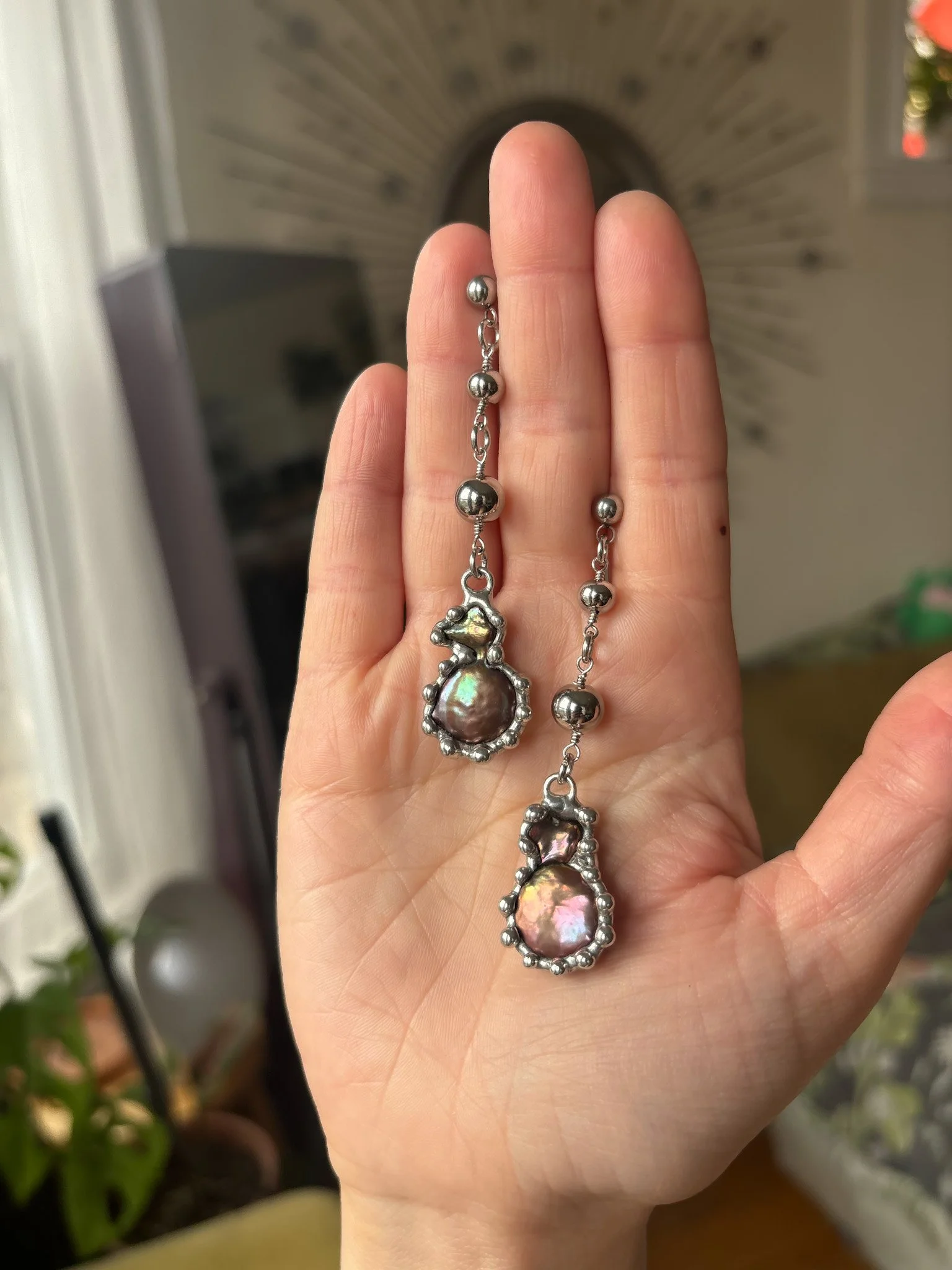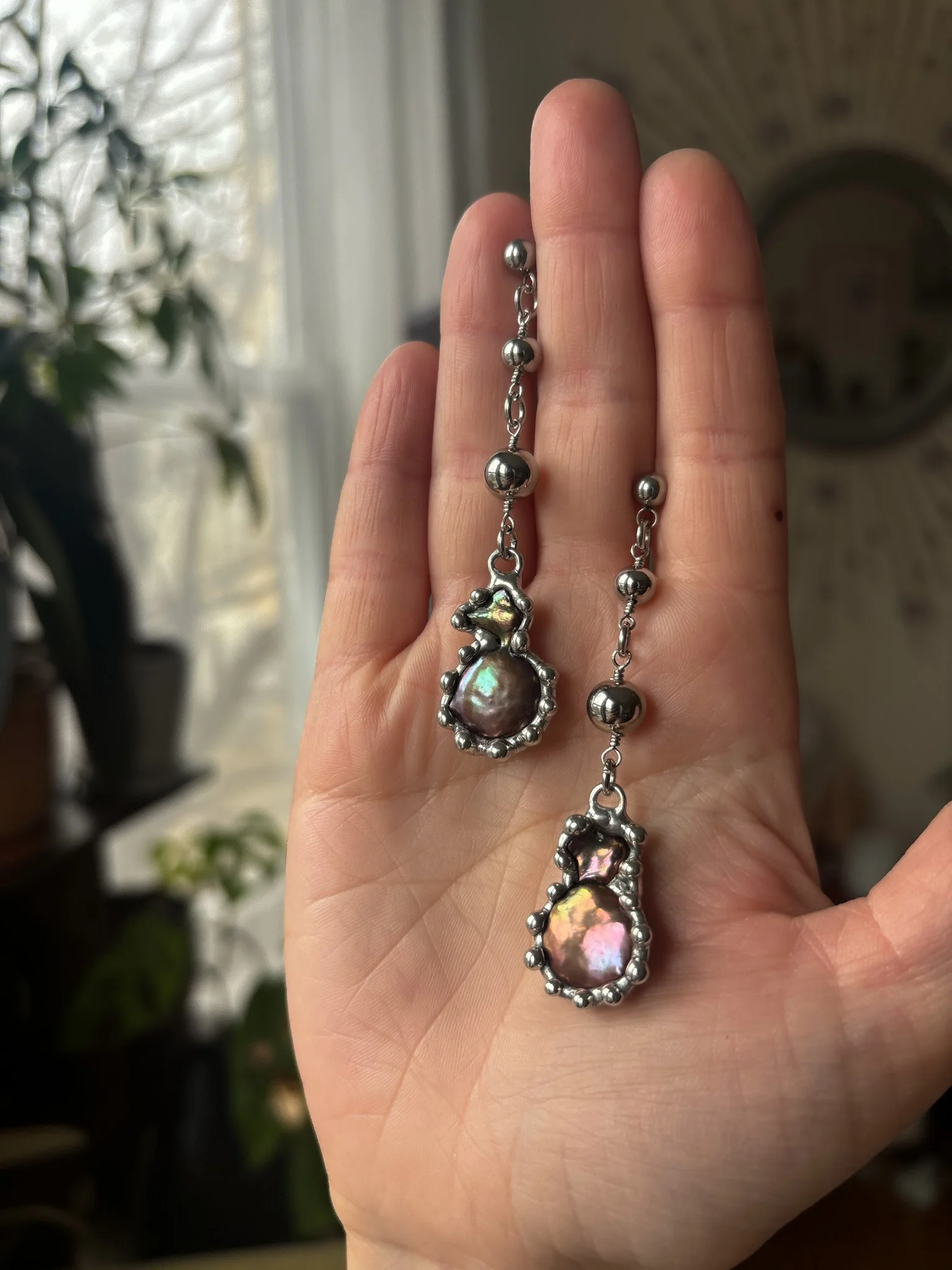 Earrings made with recycled baroque freshwater pearls. Soft soldered pendants (silver, tin, copper alloy). Stainless steel findings.